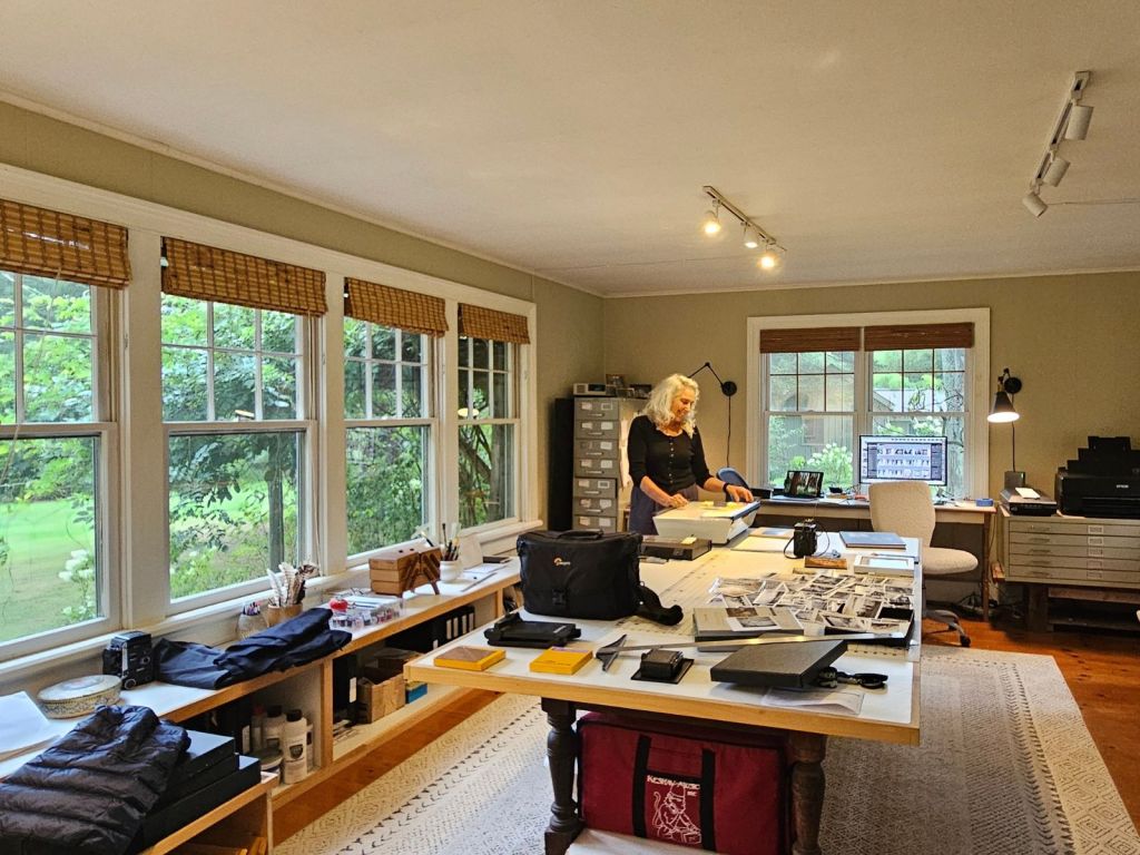 The first time I visited her studio, I was struck by the light in the space, and by how everything seemed set with intention — archive files, a big island table in the middle so she could flow around and spread the work, a dedicated area for her computer and professional scanner. I remember thinking: If I were a photographer, this is exactly the kind of space I would dream of.